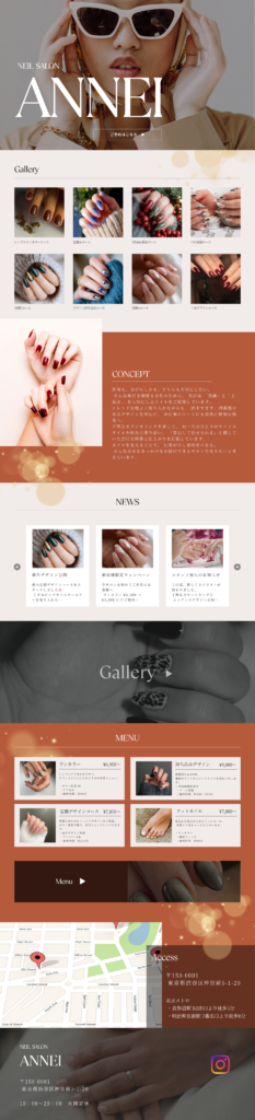 デザイン性と上品さを兼ね備えたネイルサロンの魅力が伝わるWEBサイトを想定。“信頼して任せられるサロン”としての世界観を表現することをテーマとしたいと考えている。